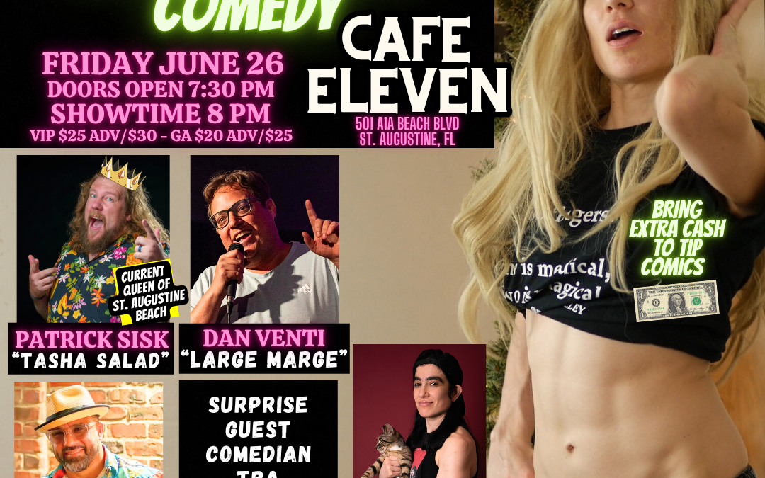 Friday June 26, at 8 PM, at Cafe Eleven in St. Augustine Beach, come see “Comedians in Drag doing Comedy”, hosted & produced by internationally touring comedian and author, Dr. Anna Lepeley.